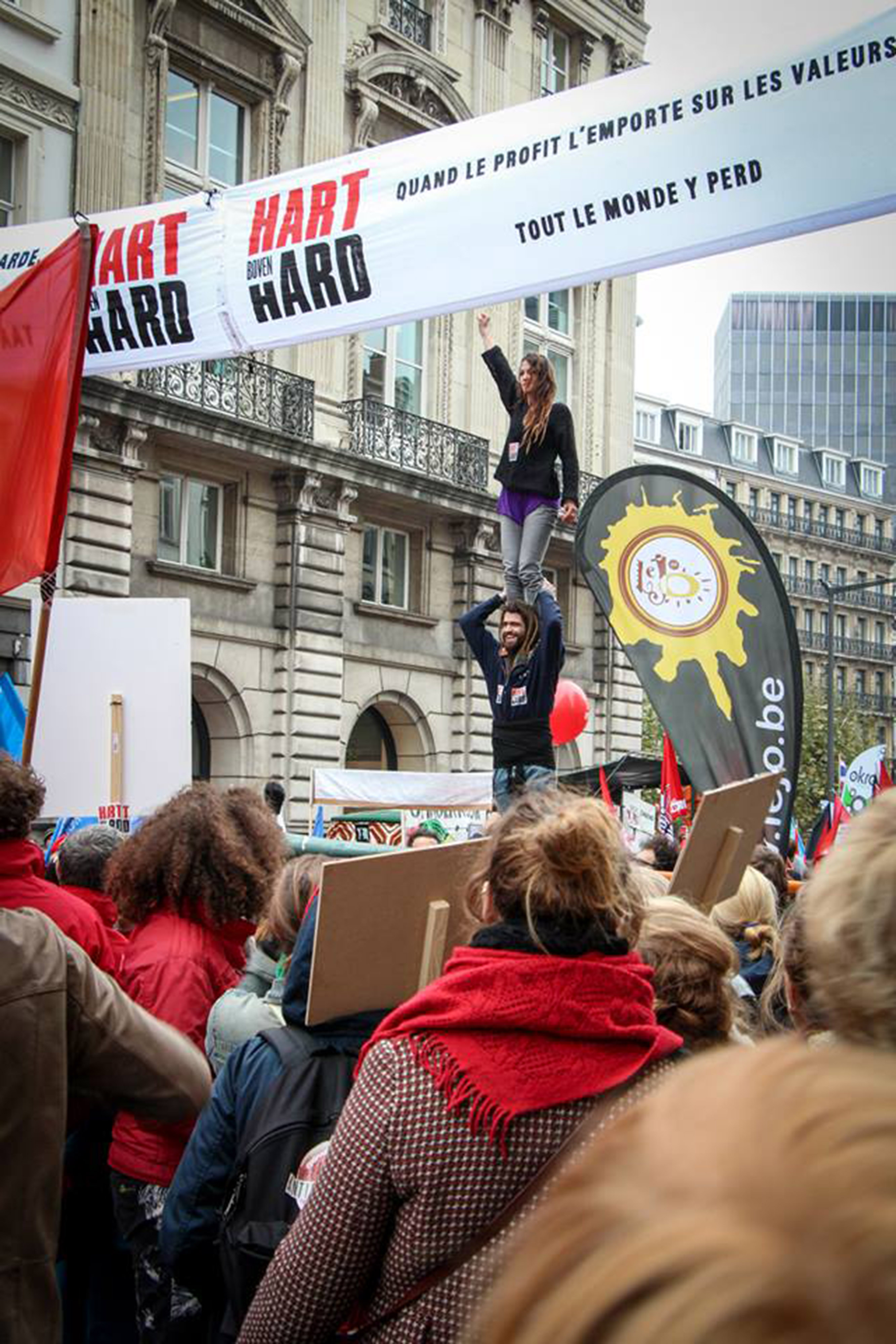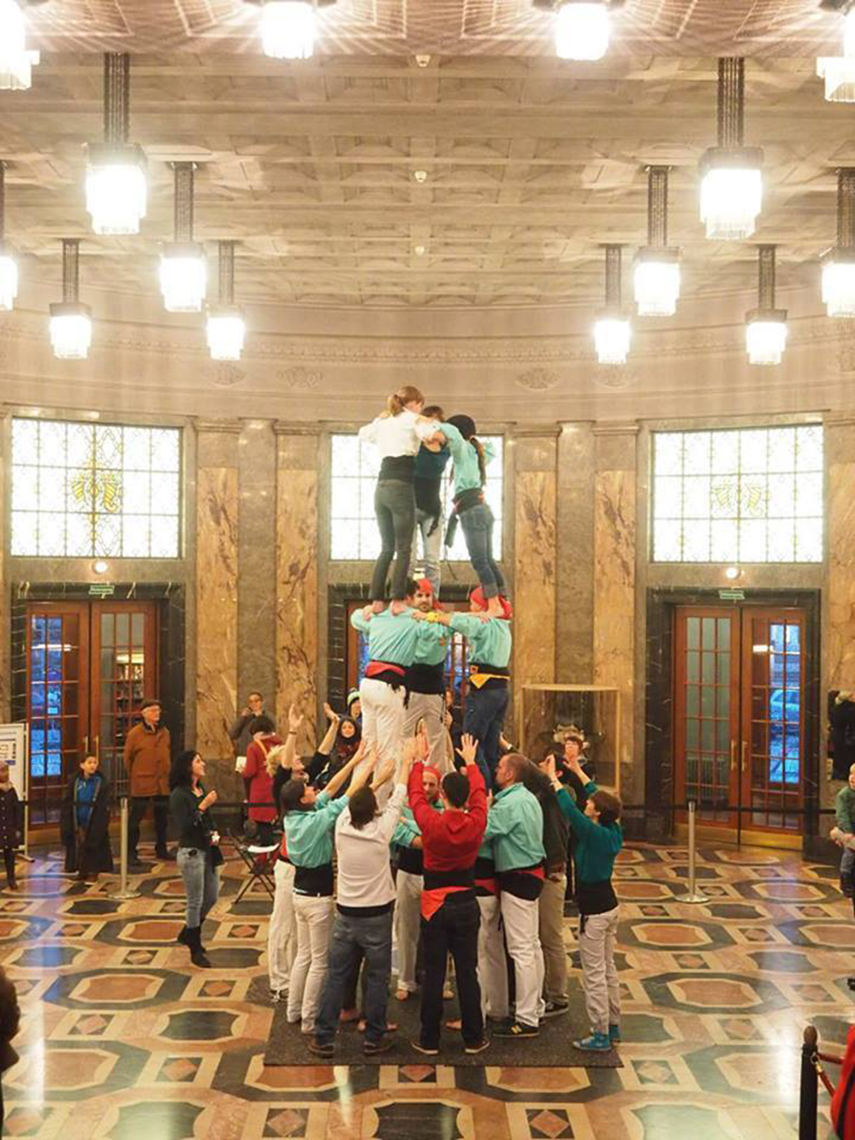 Castellers BXL Foyer are a singular case. Born as a spin-off of an arts project at the end of 2013, the majority of its castellers are neither Belgians nor Catalans, but a balance of a twentieth of several nationalities who began to build castells because the link of Marta Meix, the cap de colla, with the Foyer association of Brussels. “Everything came out because we needed people to build a castell for an arts project and we were sharing space with a gyspy association. We explained them the idea and they were very enthusiastic”. In fact, the spirit of the colla goes furthermore: “No badge, no shirt!“, says Marta at the other end of Skype. “We don’t believe on uniforms, we think that in this project everyone can join. The more people, the merrier. If you wear castellers with a uniform, the audience think that ‘other people’ are already building the castell and don’t join the pinya“. Meix prides herself upon when talks about that castells in Brussels are becoming a symbol of cultural union and struggle against inequalities. They also did castells with Castellers de Vilafranca, within the Catalans Want to Vote framework, as they made a 3de6 together. On their own, Castellers BXL Foyer have made a 3de5 without aixecador and two pilars de 4 charged.